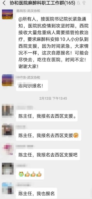 “紧急通知!医院抗疫情到攻坚时期,西院接收大量危重病人需要插管抢救治疗,要求麻醉科安排10人小分队到西院支援。时间紧急,大家自愿报名”。这是2月12日上午陈向东在工作群里发出的医院紧急通知。