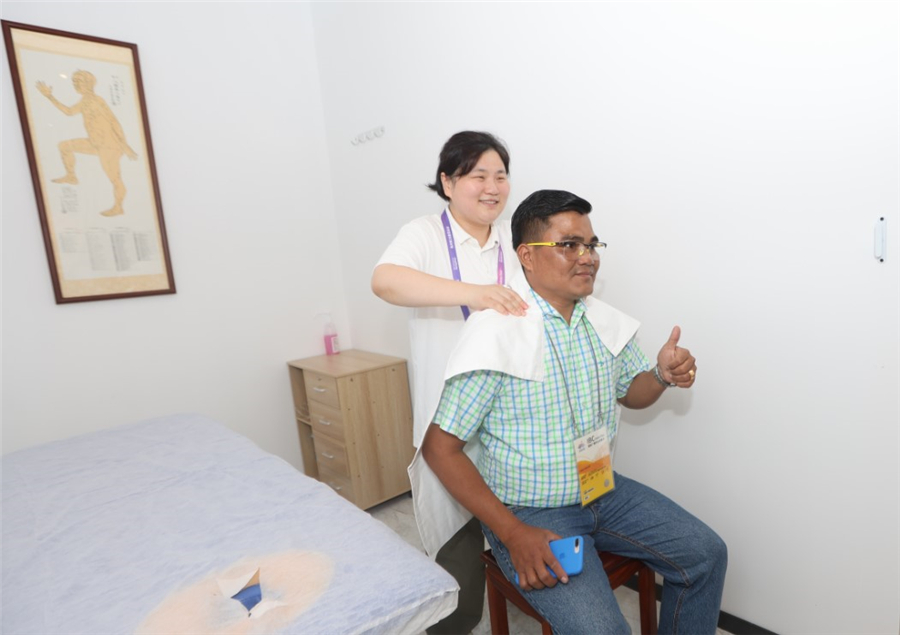 在生活服务区,令参访团成员印象颇深的是中医药文化体验馆,他们体验了推拿、八段锦。这些服务深受大家欢迎和好评,不仅让人身心得到放松,更是对中医药文化的一次深入了解和体验。