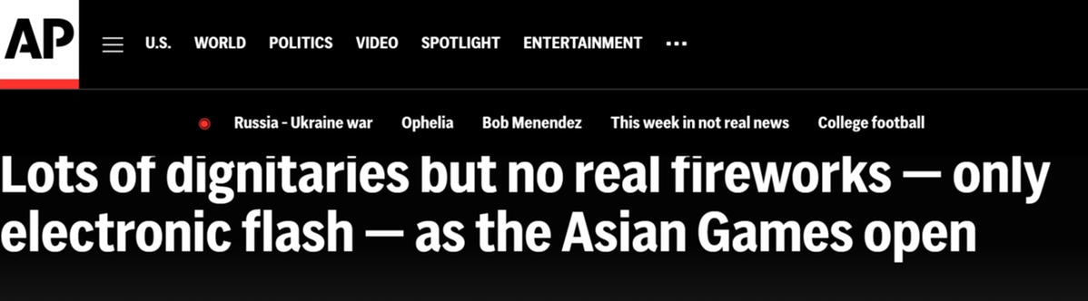 美联社报道称,烟花是体育赛事开幕式或闭幕式的常规特色,但于9月23日举行的杭州亚运会开幕式不以传统烟花表演为特色。