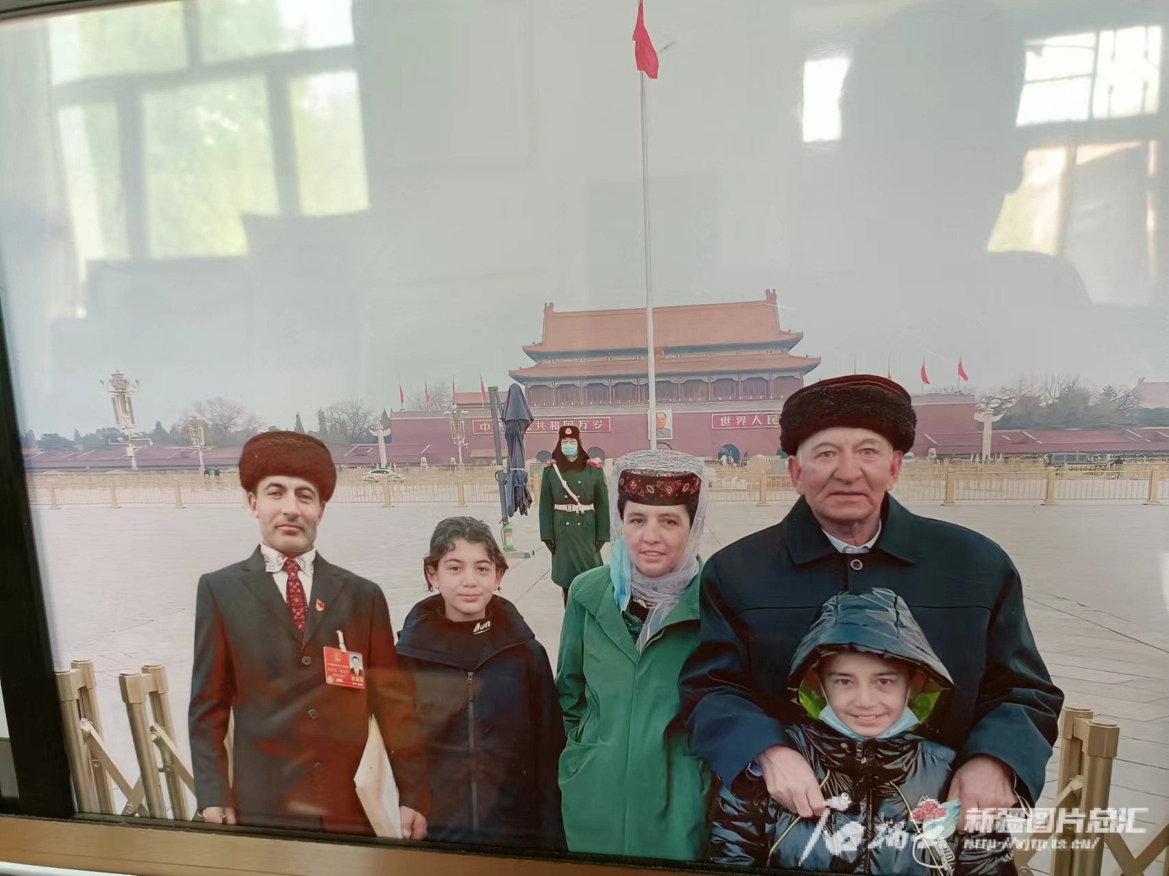 2021年3月初,巴依卡·凯力迪别克(右后一) 到北京代替为救落水儿童而英勇牺牲的儿子拉齐尼·巴依卡领取“时代楷模”奖章时,和亲人在天安门广场合影。图中左一拉齐尼·巴依卡的身影为拼接,“弥补”了一家人没有全家福的遗憾。图为天山网-新疆日报记者张治立翻拍