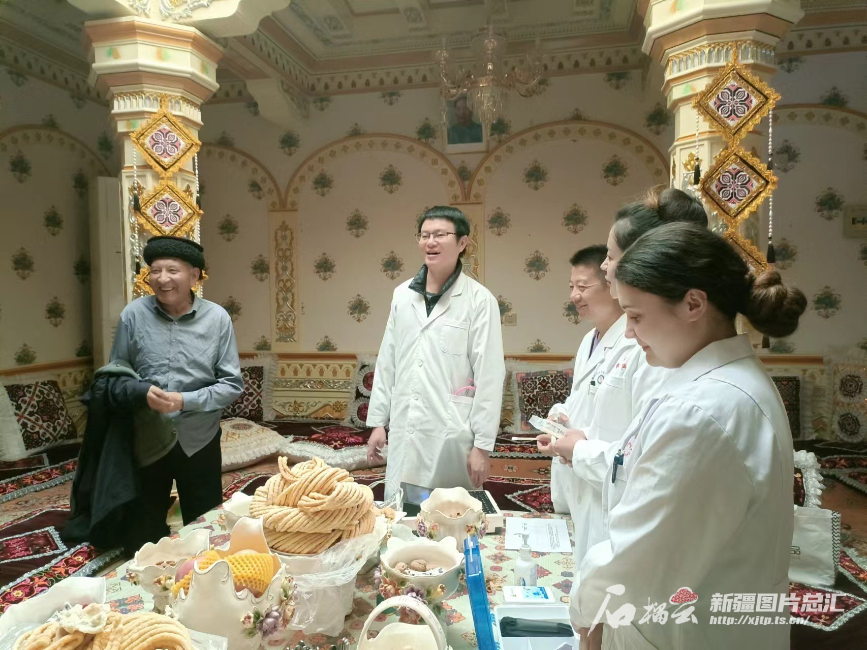 医务人员上门为巴依卡·凯力迪别克(左一)体检。天山网-新疆日报记者 张治立摄