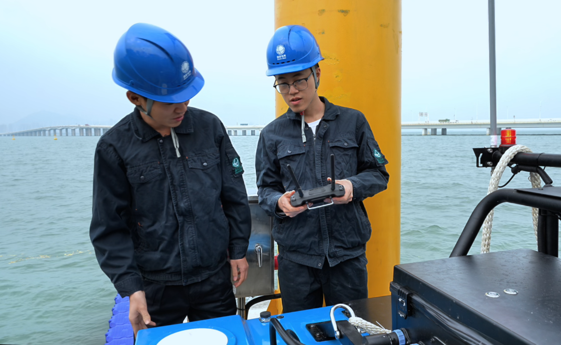 城市的另一端,厦门集美大桥西侧海域,海底电缆运维人员孙志鸿穿着厚厚的防水衣,正在进行无人艇下水前的调试。