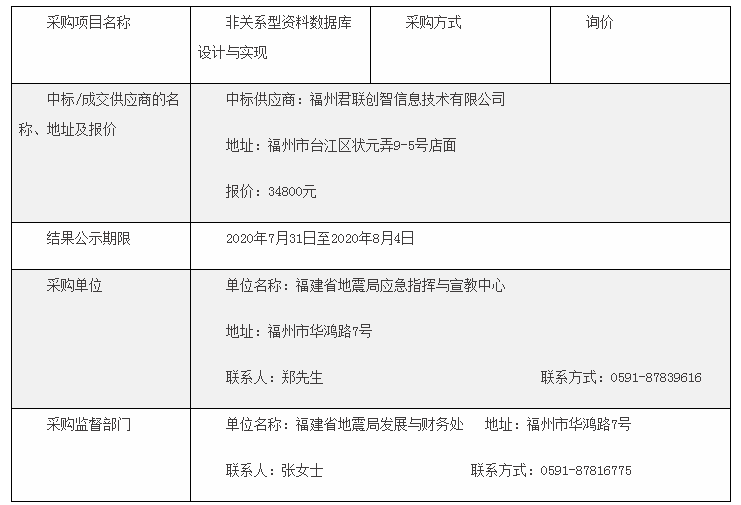 根据福建省地震局应急指挥与宣教中心2020年7月21日公布的《非关系型资料数据库设计与实现询价公告》(http://www.fjdzj.gov.cn/ar/2020072114000011.htm),截止2020年7月28日18时,共收到三家供应商的响应文件。2020年7月30日16时,采购询价小组对上述三家供应商进行综合评定,在满足采购文件实质性响应要求的基础上,拟确定报价最低的“凯发k8君联创智信息技术有限公司”为成交供应商。