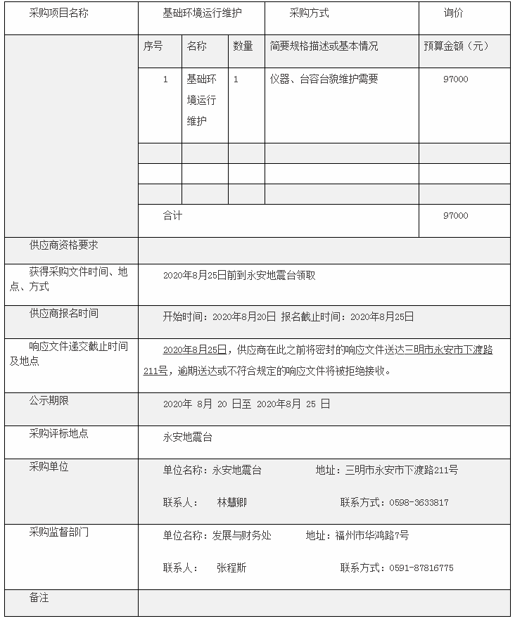 永安地震台基础环境运行维护合同采购公告