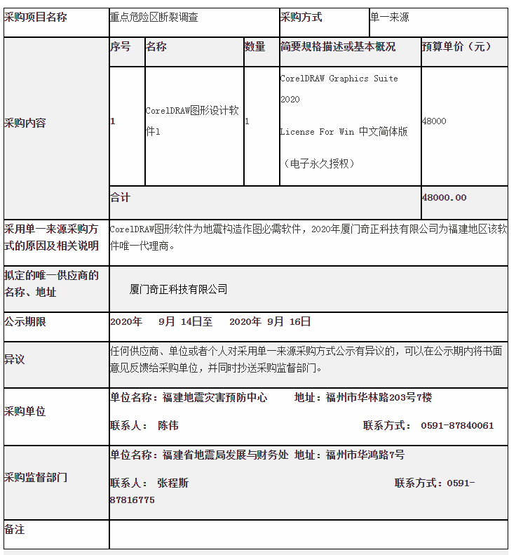 我局对2020年CorelDRAW图形软件拟采用单一来源采购方式进行采购,现公示如下: