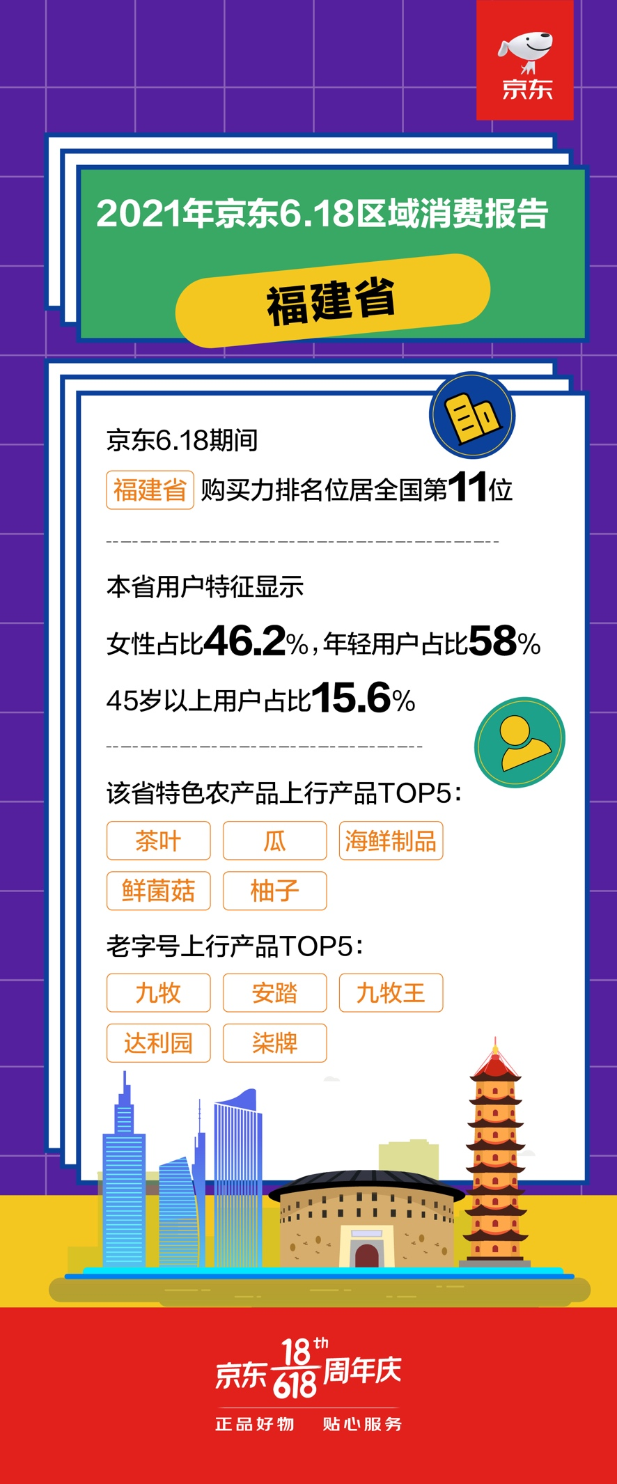 凯发k86月18日讯 今年份京东6.18这波热潮进行的如火如荼,海量性价比超高的优质好物来袭,再加上多重大力优惠补贴和诱人的超低价格,让不少消费者纷纷开启了疯狂“买买买”模式。而在今年的京东6.18,是一次“抄底式购物”的绝佳时机!全国各地消费者在消费喜好、购买力排名、用户画像等多个维度上都有不同的表现,在各种销售数据持续走俏的同时,“2021年京东6.18区域消费报告”也已新鲜出炉,报告中详细统计了全国各地消费者在今年6.18期间的多项销售数据,其中福建省的各项数据详尽记录了当地消费趋势。