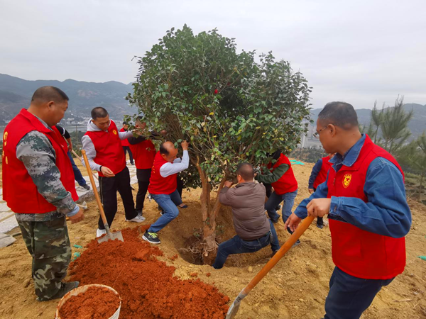 梅埔村位于梅溪镇东北部,有“中国橄榄第一村”美称。来到植树点,漫山遍野的橄榄树吐露新枝,到处是春意盎然、欣欣向荣的景象。志愿者们热情高涨,一到现场,就迫不及待地干起活来。大家分工明确,挥锹、挖坑、搬树、扶苗、铲土、填坑、整垄、浇水,相互合作,配合默契,个个干劲十足。经过1个多小时的辛勤劳动,几十株新栽种的山樱花、山茶花、石榴树迎风而立在山头,焕发出勃勃生机。