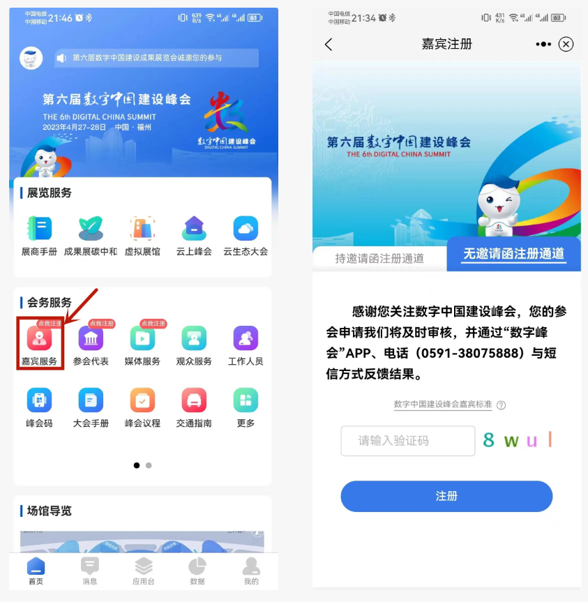 第六届数字中国建设峰会无邀请函嘉宾注册通道即将关闭!大家都报名了吗? 本届峰会无邀请函嘉宾报名注册时间截至4月20日00:00!欢迎从事数字中国建设的相关行政事业部门负责人,高等院校领导,智库和研究机构、行业协会(民政部备案)代表、专家学者,数字经济领军企业负责人,以及其他在数字经济领域作出一定贡献的代表性人员报名注册! 以下三种方式任选其一即可报名注册。 报名方式 NO.1 官网 (1)通过数字中国建设峰会官网(www.szzg.gov.cn)进入嘉宾注册界面,点击“注册账号”,有邀请函的进入“持邀请函注册通道”,无邀请函选择“无邀请函注册通道”。