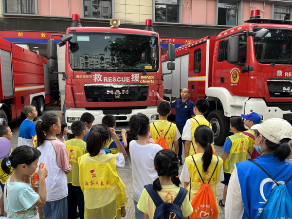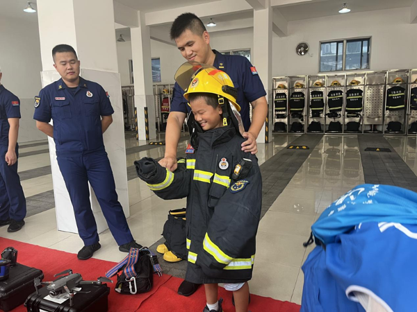在消防支队特勤大队第二支队,消防战士向营员们介绍了不同功能类型的消防车,讲解了各类探测仪、破拆器、空气呼吸器的功能,教授了营员们正确使用灭火器的方法,更邀请营员们试穿他们执行任务时所穿的“战斗服”,体验一下消防员们在冲锋陷阵时“负重前行”的感觉。
