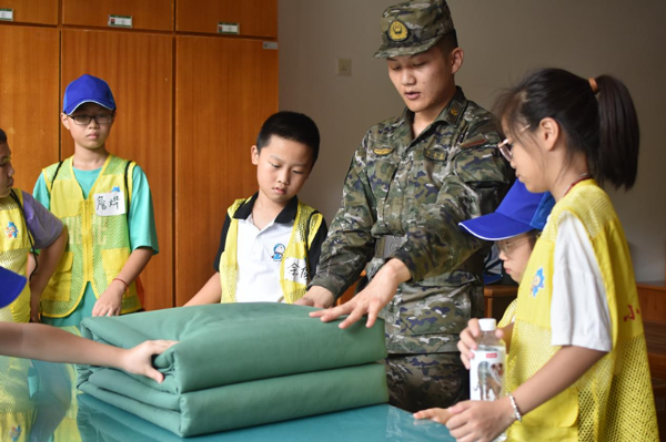 为了让营员们体验军队的训练生活,教官们将营员们分成三组,传授给他们完成标准的立正、稍息、齐步走动作的要诀。教官们带领营员们来到宿舍,手把手教他们如何把被子叠成方方正正的“豆腐块”,更鼓励他们立鸿鹄志、做奋斗者,在精进学业的同时不忘锻炼身体,争取有朝一日参军入伍,为祖国的强军建设贡献青春力量。