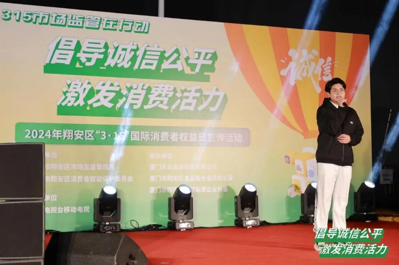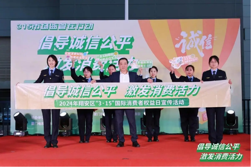 翔安区市场监管局党组书记、局长许子翼上台致辞,宣布2024年翔安区“3·15”国际消费者权益日宣传活动正式启动。