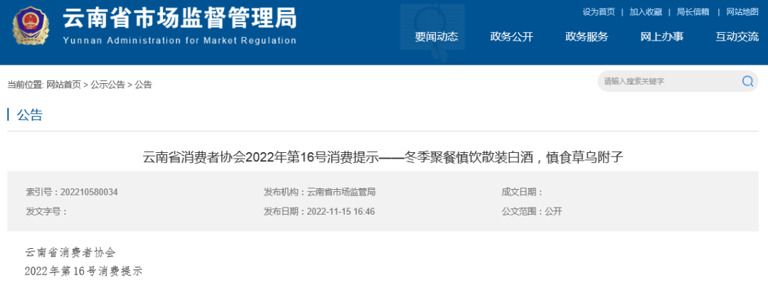 冬季聚餐慎饮散装白酒,慎食草乌附子 一、消费者要树立“自己是健康第一责任人”的健康理念,加强食品安全意识,正确选购和饮用白酒。01:选购正规厂家生产的散装白酒,购买时查看标签内容是否齐全,对明显低于市场价格的散装白酒要保持高度警惕,不采购、不饮用生产厂家不明、未经登记备案的小作坊生产加工的散装白酒,不要购买、饮用私自勾兑和来源不明的散装白酒;02:家庭自酿白酒严禁对外出售,不要在集体用餐中提供家庭自酿酒;03:农村集体聚餐主办者严禁采购无合格检测报告、生产厂家不明、未经登记备案的白酒小作坊生产加工的散装白酒及自酿酒用于集体聚餐饮用;04:白酒生产经营者严禁购买、贮存和使用甲醇、工业酒精等非食品原料。使用醇基液体燃料的各类餐饮服务单位,要加强使用环节管理,专人专位管理存放,标贴明显标识,做好领用登记,严禁同白酒混合存放。 二、草乌、附子不是食品!请广大消费者慎食草乌、附子等毒性中药材,避免中毒。01:正确认识草乌、附子等毒性中药材,在无医生指导的情况下不要擅自服食,做到不参与、不邀约、不聚众食用草乌、附子;02:经营者应严格遵守《中华人民共和国食品安全法》《医疗用毒性药品管理办法》,不以任何方式经营以草乌、附子等毒性中药材为原料的食品(包括自制泡酒)。 |