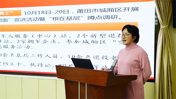 据了解,今年8月份以来,省退役军人事务厅对应思想权益、信息化建设、安置就业、优抚褒扬、军休和双拥6个业务模块,抽选了32名青年干部,组成6个“我与老兵面对面”青年干部宣讲服务小分队,共计开展了22场宣讲和9场“1+N”衍生活动,累计为超1100人次进行政策解读。此次结合第四批“根在基层”青年干部蹲点调研活动,6个服务小分队分赴南平邵武、莆田城厢、厦门思明、漳州漳浦、宁德福鼎、泉州晋江6个县(区),共挖掘出28个亮点或可推广的经验做法,查摆出33个矛盾问题,带回了33条对策建议,得到了各级的点赞好评。