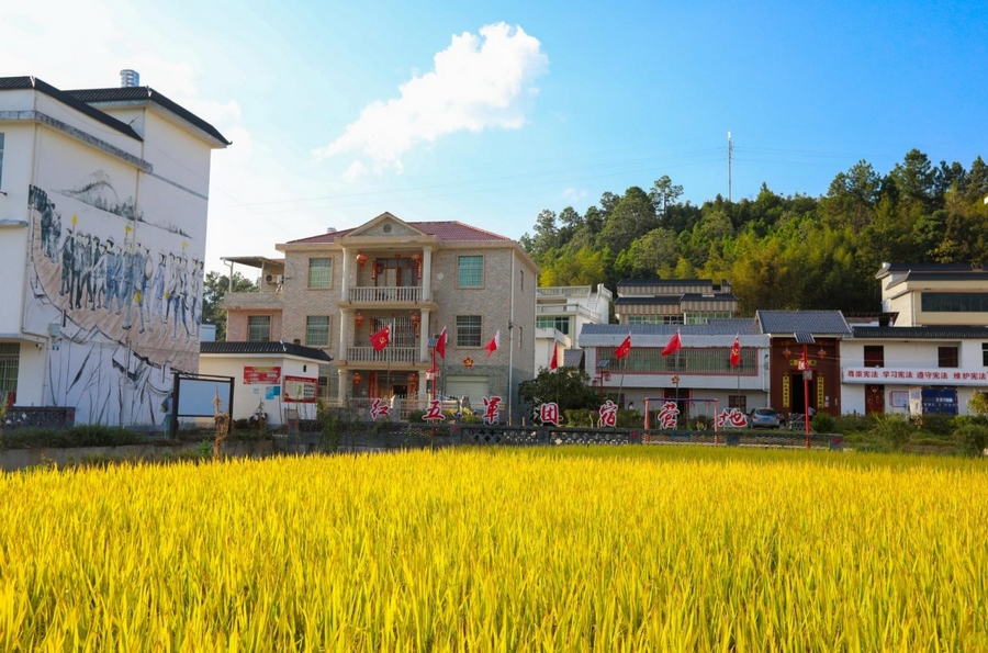 红五军团宿营地旧址稻浪滚滚、果蔬飘香,一派丰收好景象。