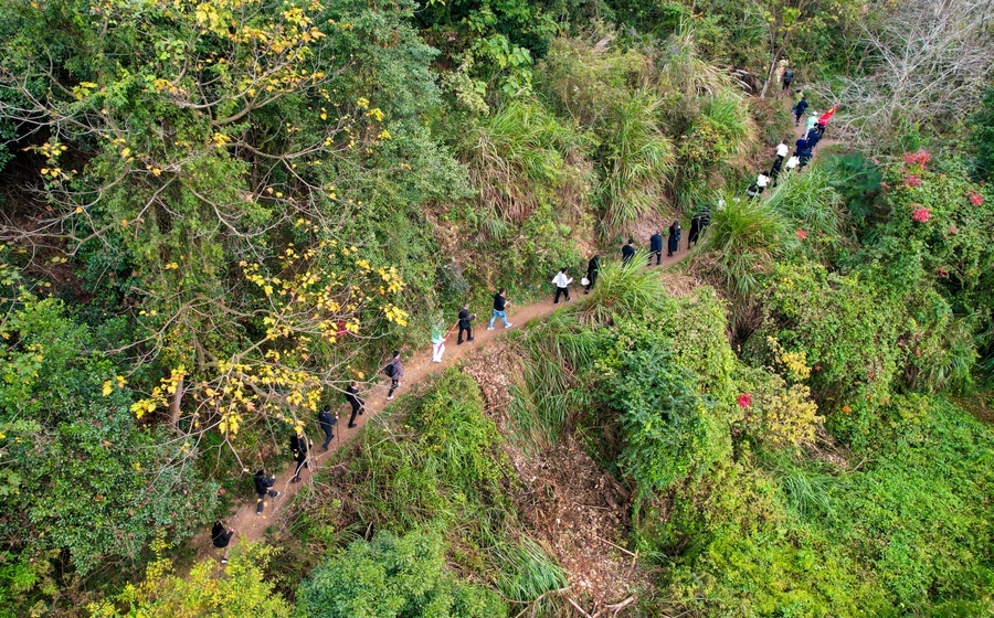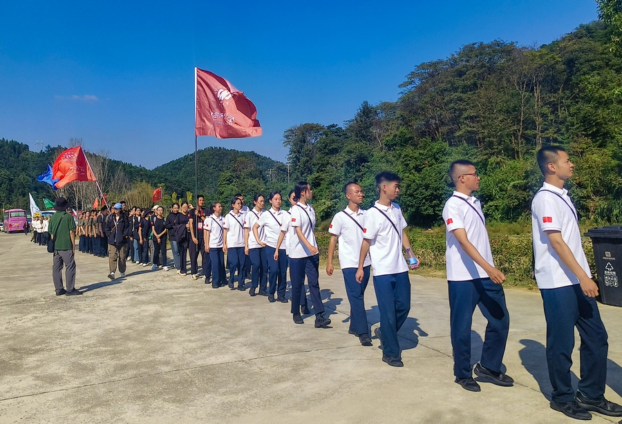 10月11日,参加“重走长征路”2024年中国大学生国旗护卫队展示赛总决赛的大学生们,来到祁禄山红军长征小道重走长征路,追寻红色记忆,感悟长征精神。