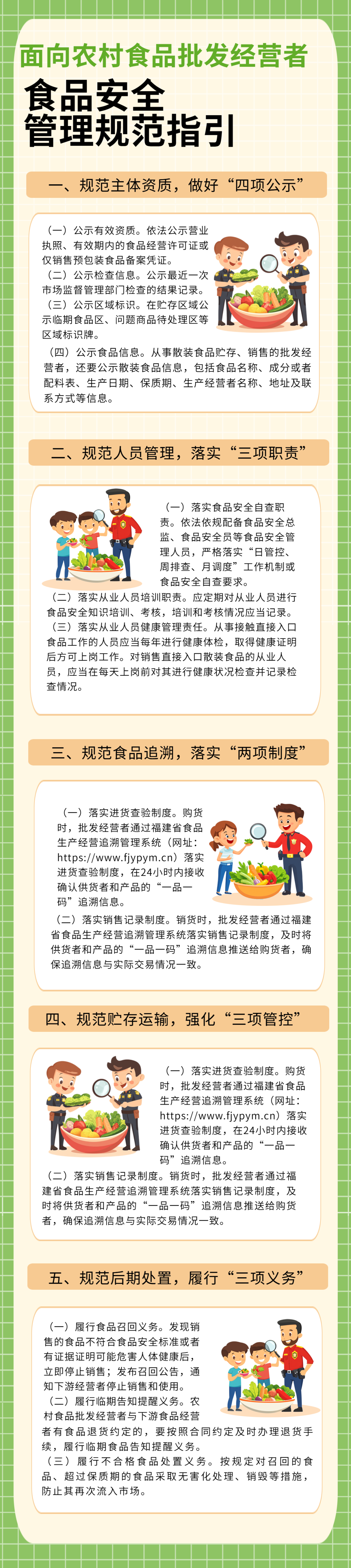 通过集中培训或走访辅导等形式,针对农村食品批发经营者每年至少开展一次培训辅导,督促指导其落实食品安全主体责任,建立食品安全风险管控清单,落实“日管控、周排查、月调度”制度,做到主体资质合法有效、亮证经营,经营场所布局合理、整洁卫生,经营过程可控、管理规范,定期开展食品安全自查,及时排查消除食品安全风险隐患。同时,要督促农村食品批发经营者严格履行食品安全“一品一码”信息追溯责任,及时在福建省食品安全“一品一码”信息追溯平台注册并按要求录入相关追溯信息,确保来源可查、去向可溯。省市场监管局组织制定了《面向农村食品批发经营者食品安全管理规范指引》(后附一图读懂),供各地参考。